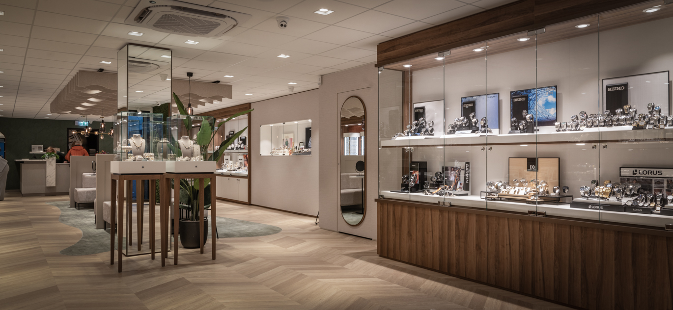La mission donnée à WSB Design était claire : créer une atmosphère luxueuse dans la bijouterie, augmenter les espaces de vente et attirer de nouveaux clients, en plus des clients existants. Le concept du nouveau magasin de luxe était le suivant : « Une bijouterie avec une base claire, des couleurs et matériaux naturels. » Un magnifique sol en PVC en chevron hongrois, du noyer chaud, des accents subtils en marbre et des couleurs contrastantes de terre et de vert mousse ont été choisis. Ces éléments dans le mobilier sur mesure apportent à la bijouterie une atmosphère accueillante et luxueuse qui attire de nombreux nouveaux clients.