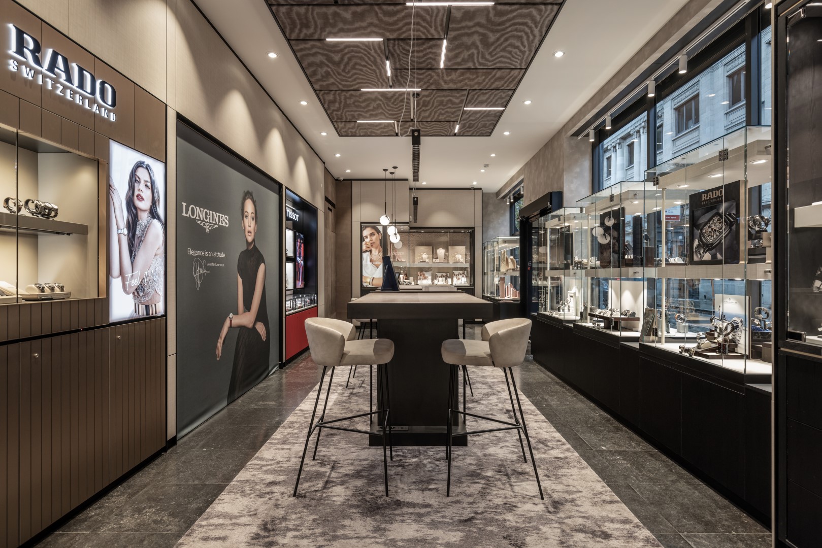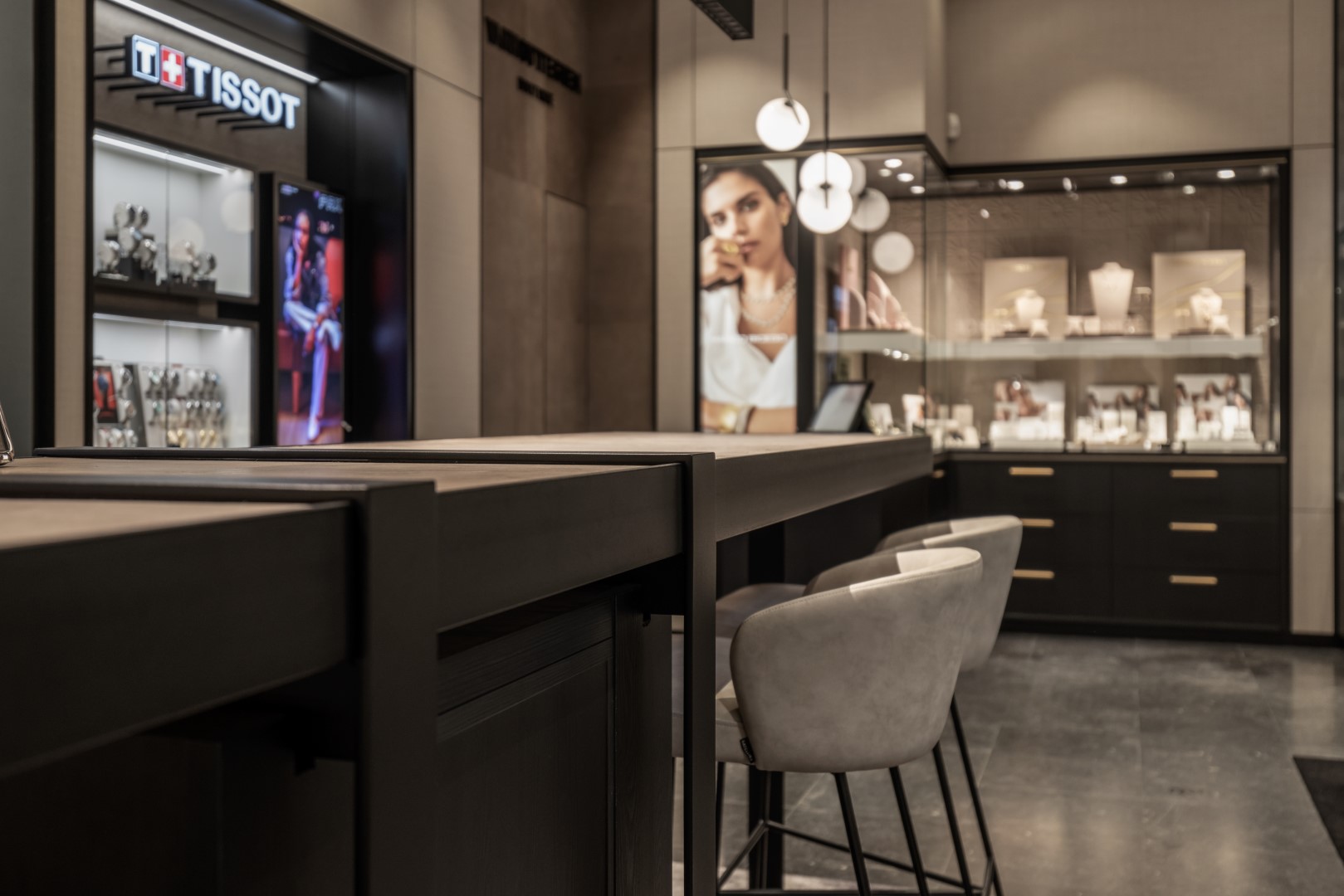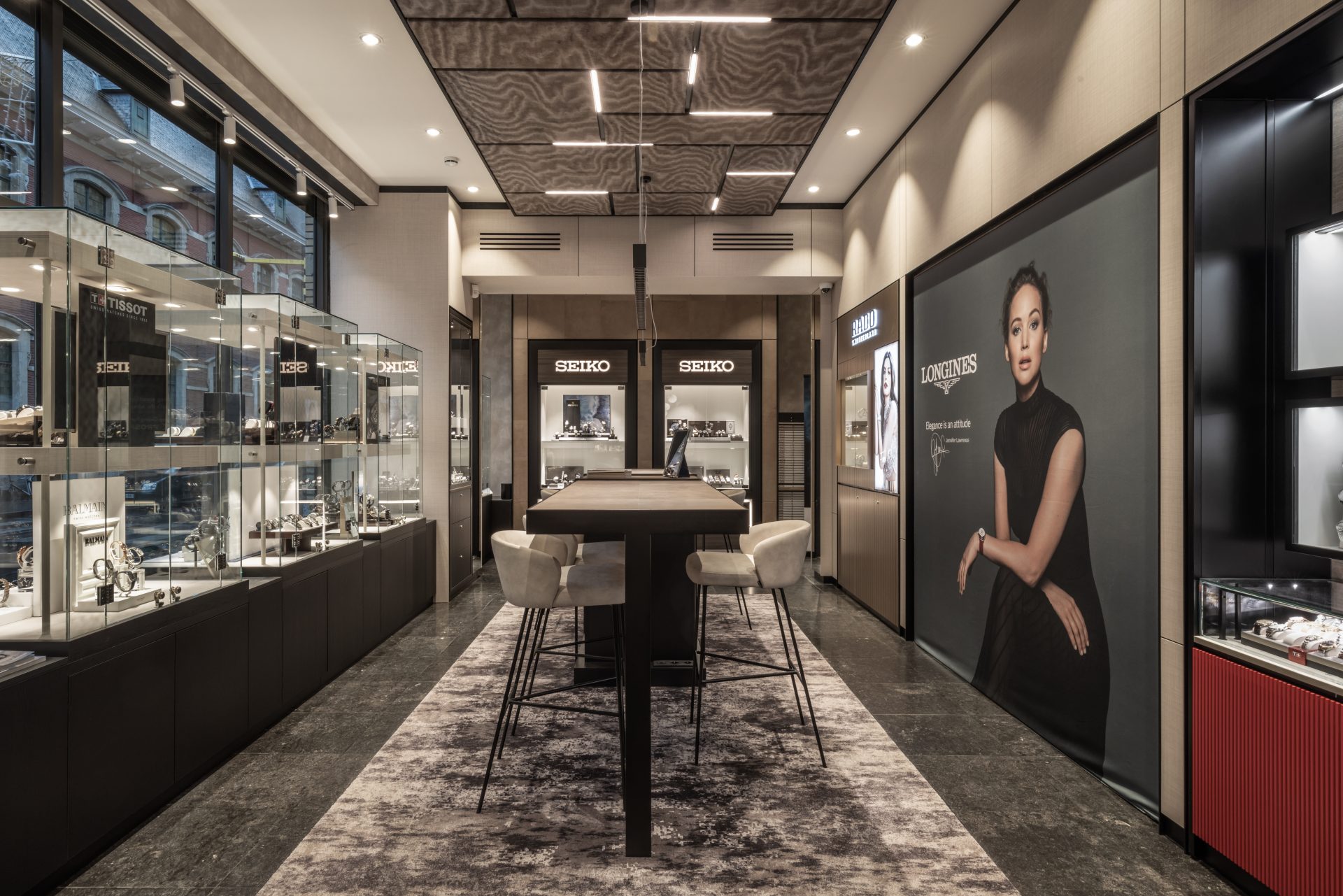 Nico Schreuder de WSB : « L’équipe de WSB a dû faire face aux défis du bâtiment, avec sa longue façade et sa profondeur limitée. Nous avons aménagé à cet effet une vitrine où les bijoux et les montres peuvent être admirés des deux côtés. Ce à quoi nous avons prêté une attention particulière en raison de l’espace peu profond, c’est que la vitrine du magasin soit suffisamment transparente pour regarder à l’intérieur du magasin et que le client soit curieux d’avoir un aperçu de l’intérieur raffiné.