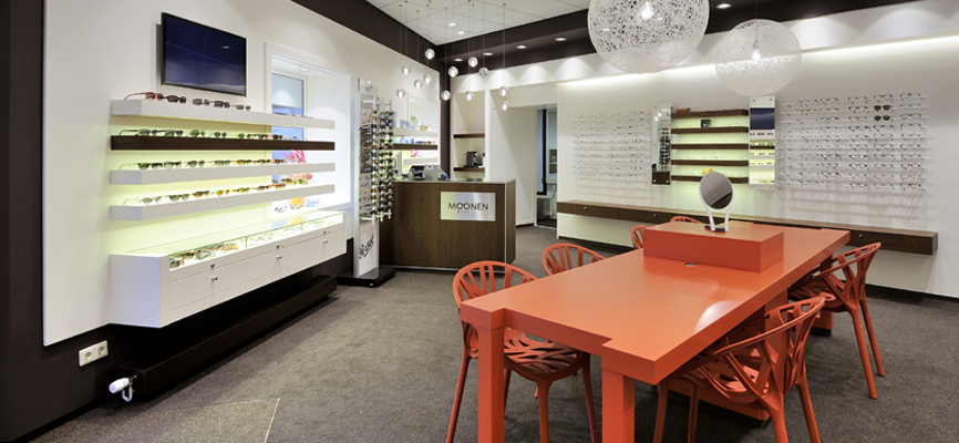 Dans le sud des Pays-Bas Moon Optique est incontournable. Le concept de détail est visible par un parfait ensemble de matériaux à la pointe des nouveautés : un mélange de matières, des murs en pierres, meubles laqués, tapis de sol. Les luminaires de Bocci et Moooi s’assemblent parfaitement a l’ensemble de l’espace et créent une ambiance intime. Les sièges sont de Vitra.