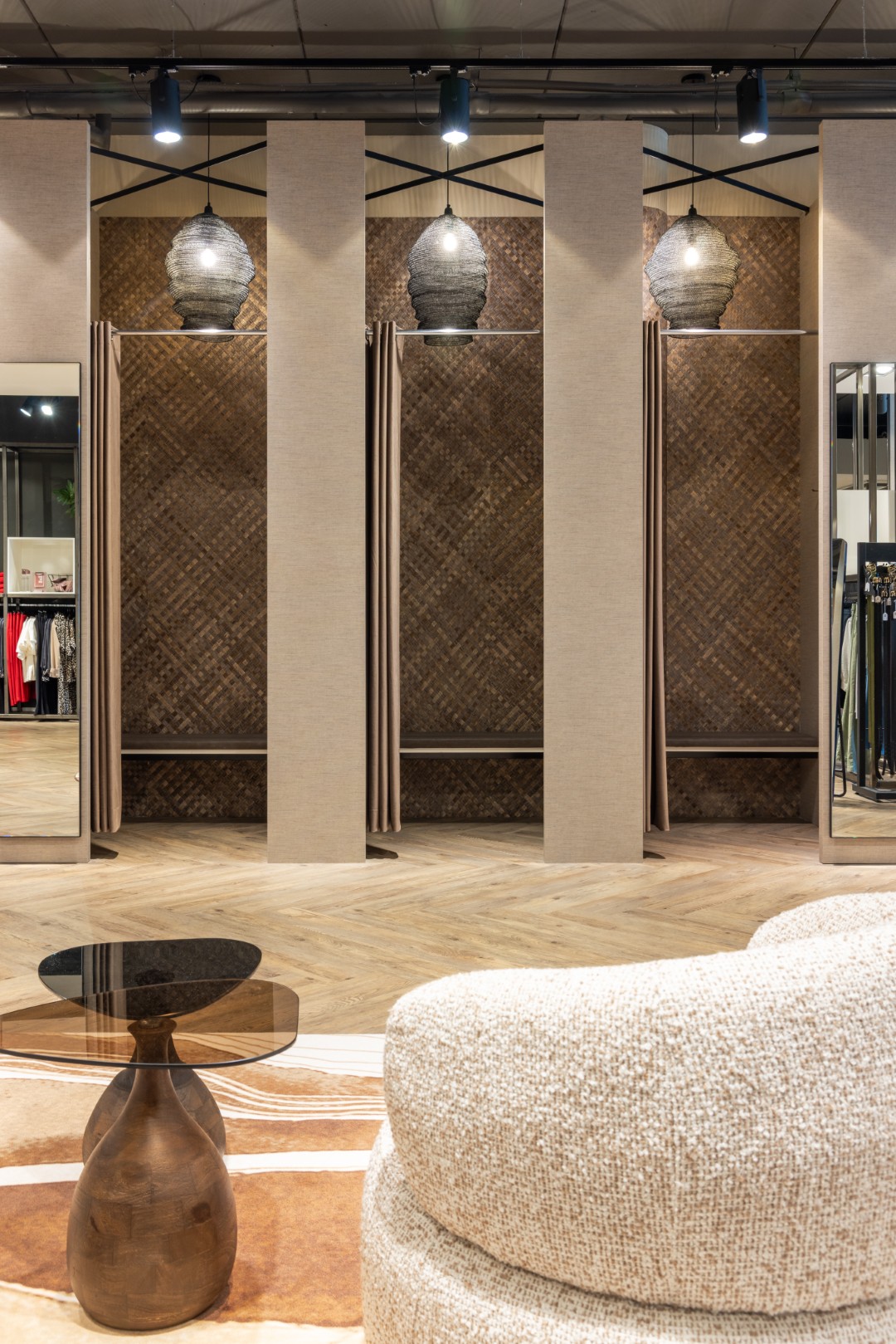 C’est pourquoi nous avons installé des systèmes de suspension hauts, suspendus au plafond. Faciles à ajuster, ils permettent de passer aisément d’une saison à l’autre ou d’un thème à l’autre. Des looks d’été légers aux collections hivernales riches : tout trouve sa place !